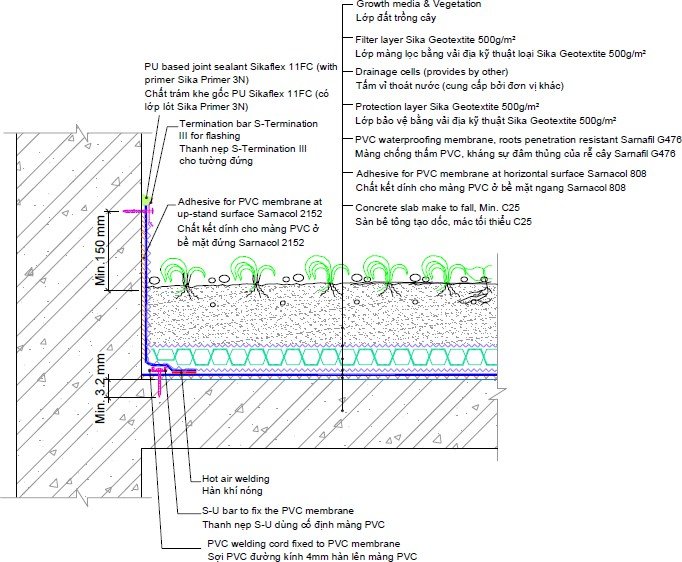 Sarnafil® G 410-15 L là màng chống thấm mái tổng hợp nhiều lớp gốc PVC (Polyvinyl Chloride), gia cường sợi polyester, dày 1,5 mm. Hàn bằng khí nóng — không cần khò lửa. Chịu UV lâu dài, kháng tác động cơ học cao, kháng rễ cây xuyên thủng. Phù hợp mái bê tông lộ thiên, mái trồng cây, mái có lớp bảo vệ sỏi/hoàn thiện. Chứng nhận CE · EN 13956 · GB 12952 · LEED v4. Đơn giá VND/M2 (chưa bao gồm VAT, tại nhà máy).
